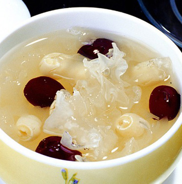 取銀耳二朵,櫻桃二兩,冰糖適量。銀耳用清水浸軟,櫻桃洗凈,去核;先將銀耳加水煮半小時(shí),放入冰糖煮溶,最后加入櫻桃,煮片刻即可食用。