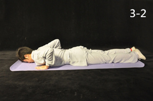 動(dòng)作2:雙手著席不動(dòng),軀干繼續(xù)前行,呈俯臥位,雙肘關(guān)節(jié)屈曲(圖3-2)