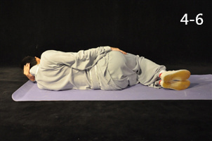 動(dòng)作7:左肘關(guān)節(jié)屈曲,左手置于耳下;同時(shí)右手帶動(dòng)右肩左轉(zhuǎn),呈側(cè)臥位(圖4-6)