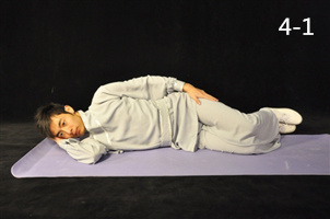 動(dòng)作1:接第三節(jié),從俯臥位轉(zhuǎn)至右側(cè)臥位,右手置于耳下,左手自然置于大腿側(cè)面(圖4-1)。