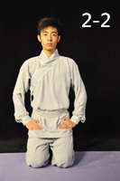 雙膝著席,足跟相對(duì),足趾向外,臀部坐于足跟上。上身保持正直,雙手握固。置于大腿根部(圖1-1、1-2)